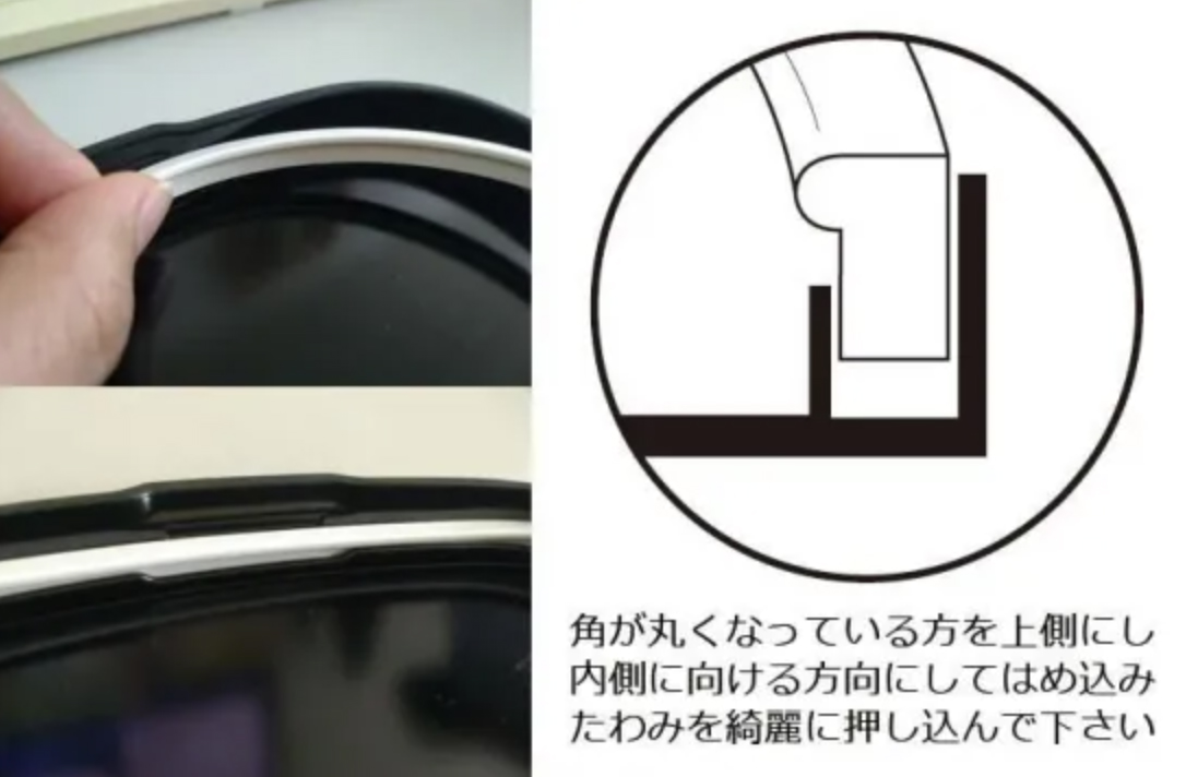 良い質問じゃ!パッキンをよく見てごらん。図のように形状に合わせて差し込むんじゃ。逆に付けると、フタが閉まりにくくなったり、隙間ができて漏れの原因になるぞ。